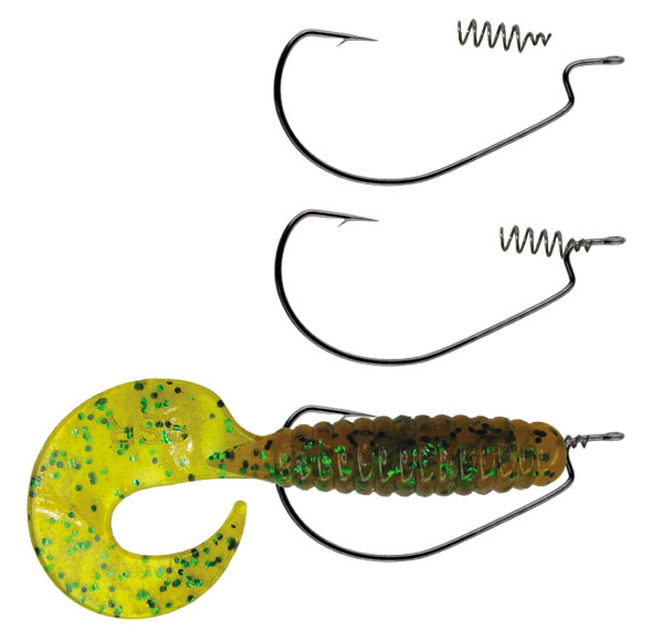 Офсетный крючок лучше подбирать с большим радиусом изгиба – надежней будет подсечка. При монтаже приманки на крючке очень хорошо зарекомендовала себя специальная конусная спиралька от киевского мастера Евгения Карачева (см. фото). В этом случае приманка держится намного надежнее, не сползая по цевью крючка. Если же такой чудесной мелочи у вас нет, полезно будет зафиксировать головку приманки на цевье капелькой моментального клея.