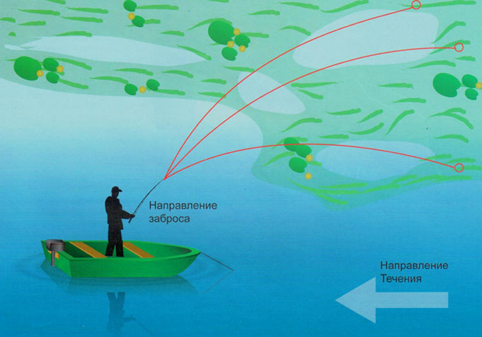 Теперь относительно месторасположения лодки, направления забросов и техники проводки. Огромным плюсом такой ловли является то, что жирующий в траве жерех не настолько осторожен, как его сородичи на открытых водных просторах – одпускает к себе практически вплотную.