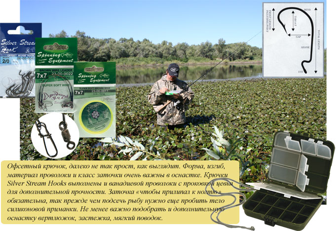 Немаловажная деталь - поскольку ловить приходится чаще всего в очень густой траве с обилием нитеподобных водорослей, которые, как знают рыболовы, буквально липнут к любой самой «незацепляющейся» приманке, желательно избегать наличия любых лишних деталей – застежек, вертлюгов и т. п. Поэтому офсетный крючок лучше всего привязывать непосредственно к основной леске, предварительно пропустив ее через отверстие грузила. С этой же целью жало крючка я слегка, буквально на миллиметр, утапливаю в теле приманки. Подсечке это не мешает, а «незацепляемость» улучшается. Еще один вариант – от места выхода крючка до кончика жала на теле приманки скальпелем делается неглубокий продольный разрез, в который и утапливается выступающая часть крючка. Использование поводка оправдано, когда высока вероятность щучьей атаки. В этом случае лучше использовать мягкий сталистый материал (типа 49-ижильного), чтобы без проблем привязать крючок и вертлюжок. Со своей стороны я бы очень советовал обратить самое пристальное внимание на монофильный материал, изготовленный на основе флюрокарбона. Мои впечатления – самые восторженные.