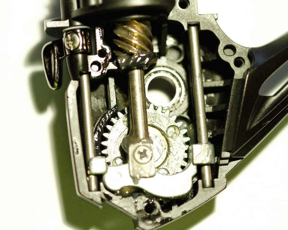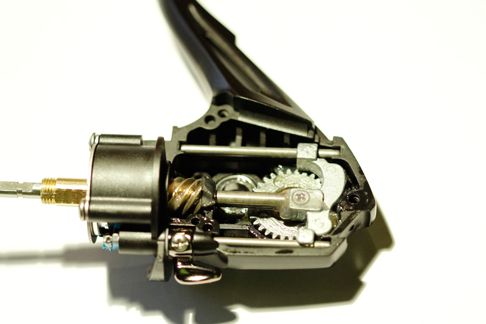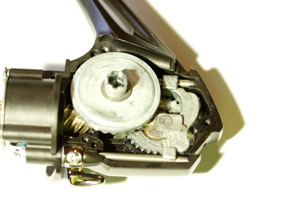 Особый интерес вызывает механика этой модели. В ней применены две опорные оси каретки, обеспечивающей возвратно поступательное движение основной оси, на которой расположена шпуля.