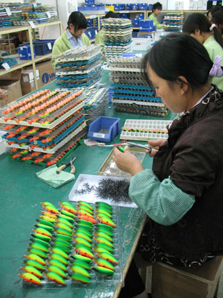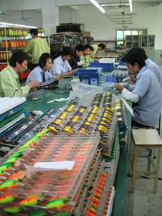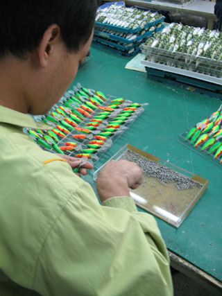 Так выглядит рабочий макет новой модели воблера. Прежде чем с это макета снимут на компьютере все координаты для станка с ЧПУ, этот макет проходит длительные испытания и корректировку. Затем когда у конструкторов и испытателей не останется больше претензий к макету, приступают к изготовлению литьевой формы, шаблона для ультразвуковой сварки и клише офсетной печати окраски.