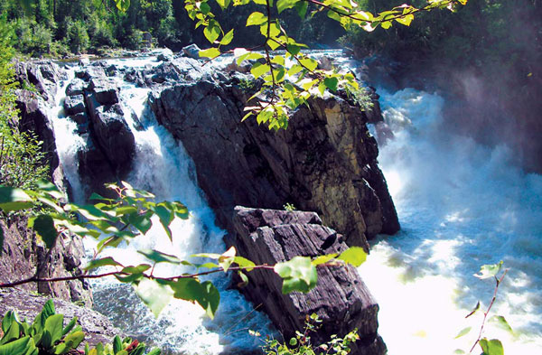 основной струи едва просматривается небольшое углубление русла вдоль берега с замедленным течением. Если бросать вертушку сразу вдоль берега и вести приманку по этой канавке, то поклевок нет вообще. Если же бросать прямо на струю, чтобы ее сносило в канавку течением, то поклевки следуют буквально сразу же. В отличие от уральских рек, где хариус предпочитал приманки с белым лепестком, здесь хорошо зарекомендовали себя вращающиеся блесны с желтым или черным лепестком. В частности — вертушки Daiwa с подгруженным сердечником, Mepps Aglia и Aglia long №3. Блесны меньше «троечки» ставить не имело смысла — сильная струя сразу же выбрасывала их на поверхность, что совершенно не привлекало рыбу. К вечеру мы наловили достаточно рыбы, чтобы приготовить вкуснейшие котлеты. «Спортсмены» к нашему приходу уже замесили хлеб, который впоследствии испекли на углях. Ужин получился на славу! Нам осталось пройти совсем немного — один поворот реки — и тут же зачалиться перед водопадом. Главное— не влететь в него сходу! Андрей Артурович заранее проинструктировал группу: в случае внештатной ситуации держаться катамарана до тех пор, пока он обеспечивает безопасность. В противном случае, бросать кат и цепляться за любой камень, любой выступ скалы, по возможности пытаясь выбраться на берег. Вещи, катамараны — не главное, потом выловим, что сможем. Водопад «Хармын-Дулю» («Прыгающая Белка») очень красив, и его созерцание с лихвой окупает усилия, затраченные на то, чтобы к нему добраться. Вода шла через все три желоба в скале, образующей сам водопад, что бывает, судя по отчетам, только при самых высоких уровнях реки. Скала, давшая водопаду его поэтическое название, наполовину утопала в пене и брызгах и ничем не напоминала стремительно прыгнувшего в реку зверька. Однако двенадцатиметровый водопад менее красивым от этого не стал. Дальше шел сложный участок шивер и порогов. От поднявшегося сильного встречного ветра навалилась усталость: каждый гребок отнимал силы, и даже вернуть весло в исходное положение удавалось со значительным усилием. «Серой Ямкой» (порогом 4 к.с.) заканчивалась спортивная часть нашего похода. Группа