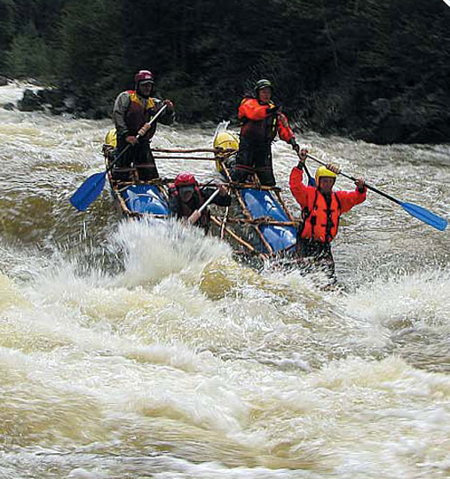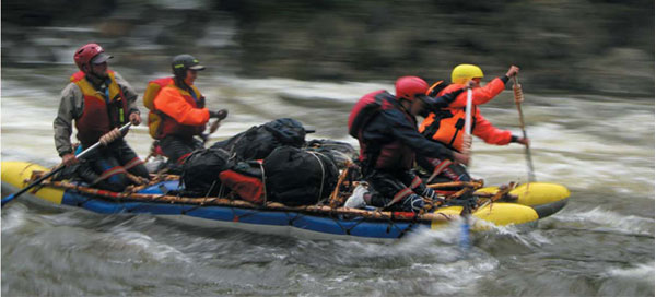 есть укрытие — крупный камень, но это как раз редкость. Река рельефом дна не балует, все очень однообразно. Группе понравились рыбные деликатесы, поэтому Сержу была дана полнейшая свобода — идти первым катамараном и останавливаться в любых перспективных, с точки зрения рыбалки, местах на любое количество времени, лишь бы была рыба на ужин. Он обрадовался несказанно, хотя, река большими уловами не баловала: на «поесть» поймать удавалось, и на том спасибо. Перед выходом на воду все участники сплава облачаются в гидрокостюмы, спасжилеты и каски. Вещи запаковывают в гермомешки и туго привязывают стропами к катамарану, чтобы ни мощным валом не смыло, ни при перевороте не сорвало. С этой же целью используется и коленная посадка для водников, при которой ноги надежно зафиксированы — это и безопасность при движении, и широкие возможности для маневров. Что бы ни случилось (например, катамаран перевернулся), никогда нельзя выпускать из рук весло и всегда стараться держаться за катамаран. Все серьезные пороги непременно просматриваются с берега, оговаривается наиболее безопасная линия их прохождения, натягивается страховка, организовывается фото и видео съемка. Сережа, как и я, числился матросом на четырехместном катамаране, т.е. сидел спереди и выполнял все команды позади сидящего капитана.