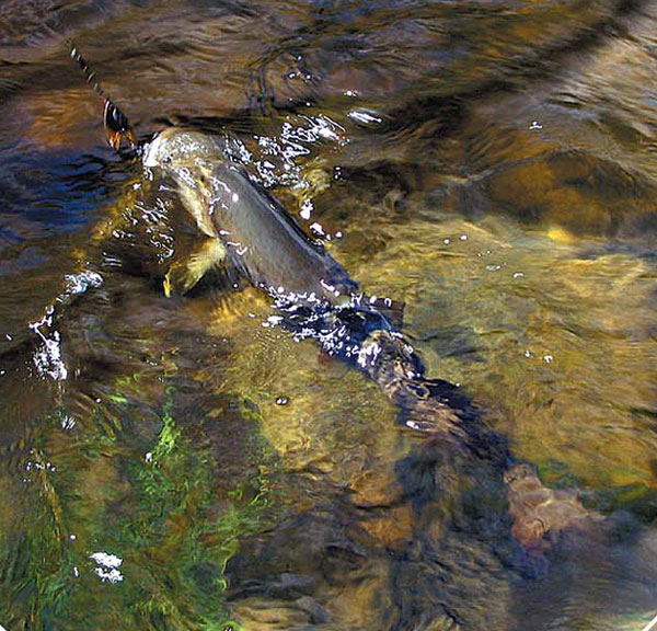придавали особый колорит скудному туристическому рациону. 30 июля большая часть группы, заисключением заболевших и страстных рыболовов, ушла в трехдневный походвосхождение на г.Ханула - самую высокую вершину хребта Хамар-Дабан-2371 м. В верховьях искупались в красивейшем озере с изумрудной водой, полюбовались каскадом водопадов, бескрайними хребтами Хамар-Дабана. Вернулись уставшие, но довольные. Пойман первый ленок. Красавец! Серж не сразу понял, что клюнула хорошая рыба — удар, и все. И тут рыба разворачивается и начинает уходить. Визжит фрикцион, летят брызги! Постепенно сопротивление ослабевает. Чтобы как-то вывести рыбу на обрывистый каменистый берег, пришлось зайти в воду мне и, за неимением подсака, руками выбросить уставшего ленка на берег. В брюхе обнаружили мышку, кузнечиков, гусениц и больших муравьев. Отметили закономерность — ленок стоит на замедляющейся струе, слегка даже коричневатой. Хариус — на струе, особенно, если