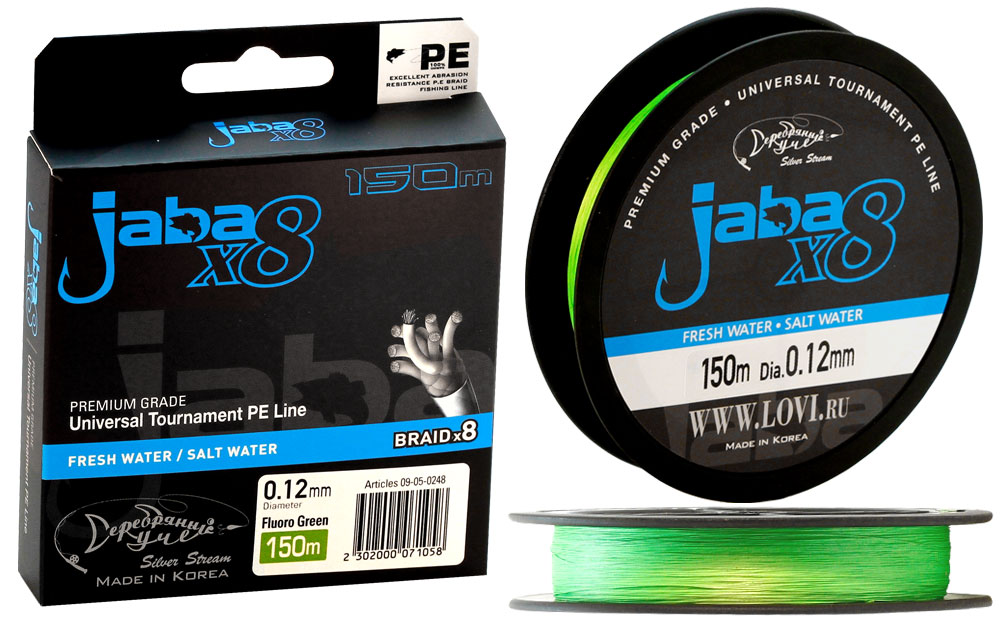 Плетеный шнур JABA X8 это новая технология плетения с высоким преднатягом исходных волокон, что обеспечивает высокую плотность плетения 8 нитей. Оборудование для такого процесса стоит только на 4 заводах Японии и Кореи. Новый термохимический способ поверхностной окраски с дальнейшим нанесением защитного слоя из силикона. Силиконовое покрытие повышает устойчивость шнура к повреждениям по коряжнику, корням и ракушечнику. В основе серии новая марка высокомодульного полиэтилена PE, разработанная ведущим японским производителем с применением особо тонких волокон 10 и 15 Din. Такие исходные волокна выпускают только японские производители, с ограничением по экспорту. Шнур 8 нитей это увеличение дальности заброса, низкий уровень шума по кольцам и высокий тактильный контроль за приманкой, при проводке и анимации.
