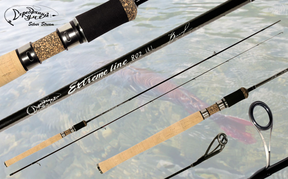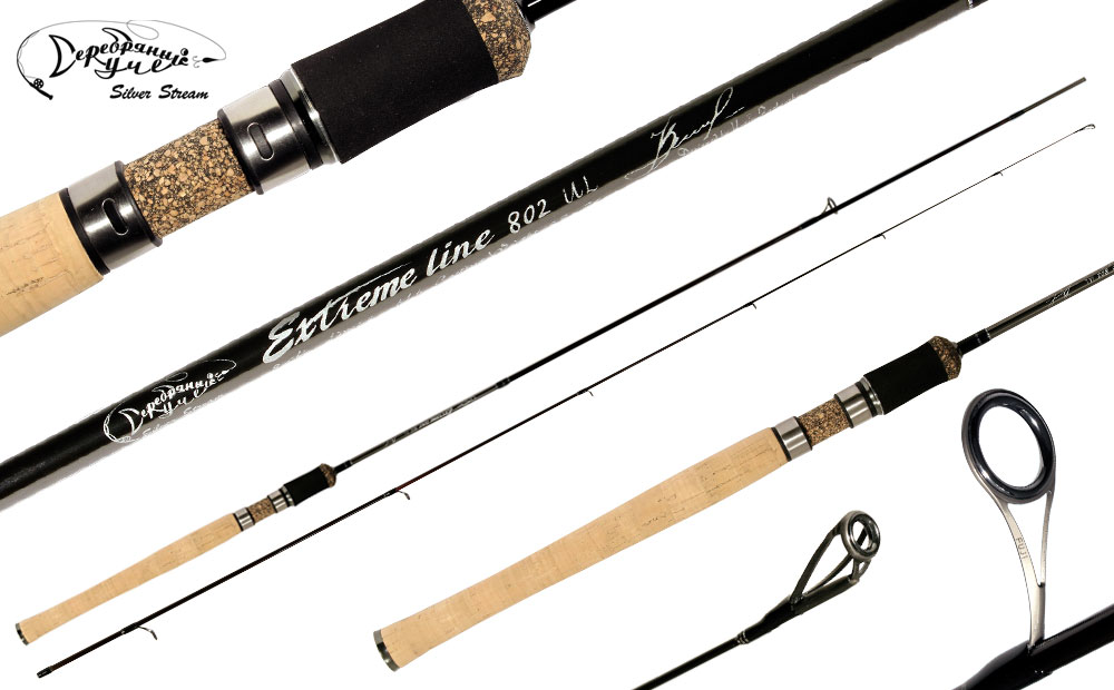 конструкторов ТД Серебряный ручей. В основу серии положен принцип «Ультралайт – для крупной рыбы».Современная тенденция облегчения спиннинговой снасти поставила перед конструкторами задачу создать спиннинговую снасть, одновременно позволяющую использовать тонкую оснастку и миниатюрные приманки и в то же время с успехом бороться с достаточно крупной рыбой. Три года напряженной работы, тестирований и поиска завершились успешно. Немалую роль в создании серии ультралайтовых спиннингов превосходящих все аналоги, сыграл новый материал SVF GRAPHITE. Аббревиатура материала расшифровывается как материал с увеличенным объемом волокон. Иными словами, в спиннинговом бланке пропорция между углеволокном и связующим резко изменилась в пользу графита. При этом материал обладает значительно более высокой прочностью, эластичностью и коэффициентом упругих деформаций. Подобные свойства позволили создать спиннинговую серию с беспрецедентными рабочими характеристиками. На протяжении всего две тысячи пятого года, шли широкие испытания сигнальных образцов. Спиннинги зарекомендовали себя с самой лучшей стороны. С одним из этих спиннингов российская сборная завоевала первое место на чемпионате мира. Чемпион мира Владимир Габелев, дал высокую оценку спиннинговой серии Extreme Line. В процессе испытаний, при съемках, фильма из серии «Серебряный ручей» были сняты кадры борьбы с этим спиннингом с восьмикилограммовой щукой, девятикилограммовым сомом и пятикилограммовой кумжей. Спиннинг с честь выдержал все испытания, войдя в элитную серию спиннингов Silver Stream. На спиннинге Extreme Line-Z применена новая модель колец японского концерна FUJI. Арматура колец выполнена из титана, вставки из SiC. Эта модель колец обладает минимальным весом и новой противоударной системой, защищающей вставки SiC от разрушения. Грибок рукояти выполнен в виде металлического балансира с выгравированным на нём логотипом Silver Stream. Этот металлический элемент, помимо декоративной функции, придаёт спиннингу идеальный баланс, что немаловажно при кистевых забросах. При изготовлении катушкодержателя использованы материалы, обеспечивающие наиболее комфортную рыбалку. Использование прессованной прорезиненной пробки позволило сделать рукоятку более износостойкой и надёжно закреплять ножку катушки.