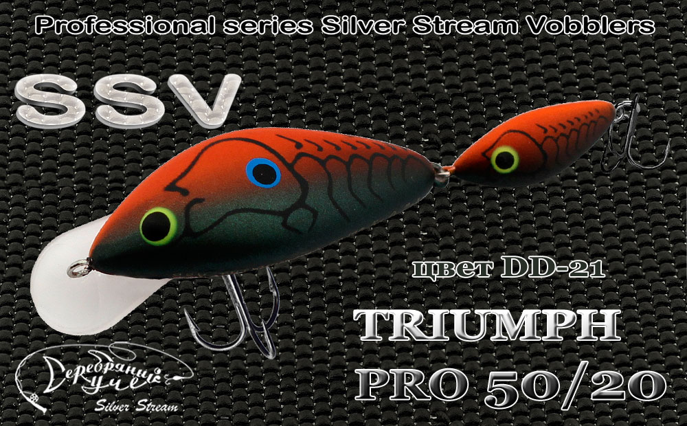 Модель воблера TRIUMPH PRO хорошо знакома спиннингистам. В 2014 году линейка этого воблера дополнена сочлененной модификацией TRIUMPH PRO -50/20 . В основу идеи модификации лег эксперимент с подсадкой на задний тройник воблера TRIUMPH PRO малька. Результат был очень хороший. При этом воблер создает эффект двух рыбешек перемещающихся с неестественным поведением. Этот тандем, очень хорошая провокация для хищника и многочисленные эксперименты это подтвердили.